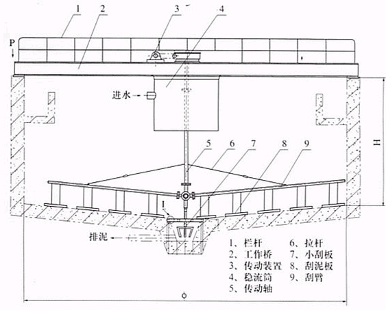 GJ型中心傳動刮泥機廣泛應用于給水工程中的沉淀池排泥,整機載荷都作用在工作橋中心。污水經中心穩流桶布水后流向周邊溢水槽,隨著流速的降低,污水中的懸浮物被分離而沉降于池底,由刮板將沉淀的污泥刮集到中心集泥槽中,靠凈水壓力將其從污泥管排出。