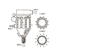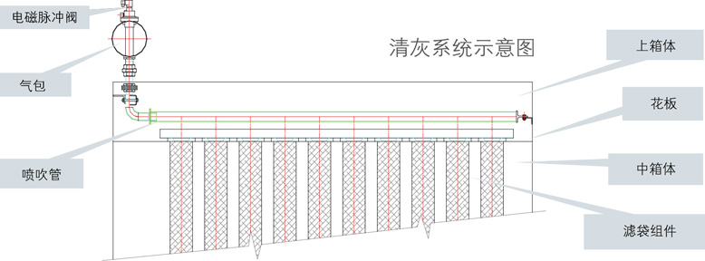 具有離線清灰、離線檢修功能(即可實現不停機檢修)、采用固定式管噴清灰技術的高效低壓脈沖袋式除塵器的過濾方式為外濾式,即含塵氣體在濾袋外、過濾后的潔凈氣體在濾袋內部,并通過排風總管排放。