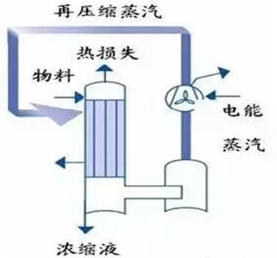 如圖所示,將蒸發過程中產生的二次蒸汽進行壓縮,然后返回蒸發器作為加熱蒸汽。