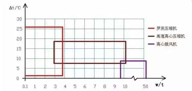 下圖為羅茨壓縮機、高速離心壓縮機和離心鼓風機的溫升—流量關系。